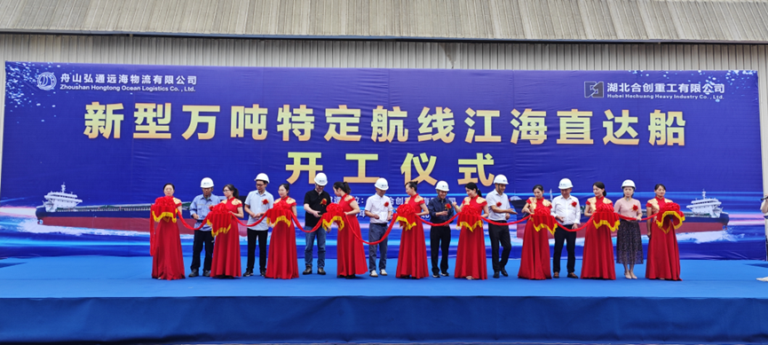 湖北合創(chuàng)重工舉行舟山弘通遠海物流新型萬噸特定航線江海直達船船建造開工點火啟動儀式。舟山市港航和口岸管理局、舟山弘通航運發(fā)展有限公司、湖北合創(chuàng)重工有限公司等主、承、協(xié)辦單位領(lǐng)導、各工程項目單位代表、部門成員共計50余人參加儀式。